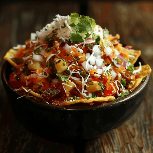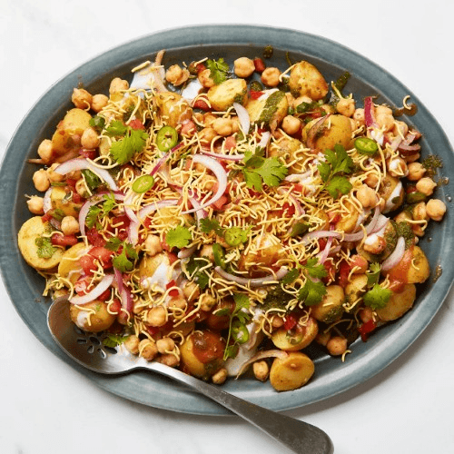 Crispy puris filled with spiced chickpeas, potatoes, and chutneys, all smothered in creamy yogurt