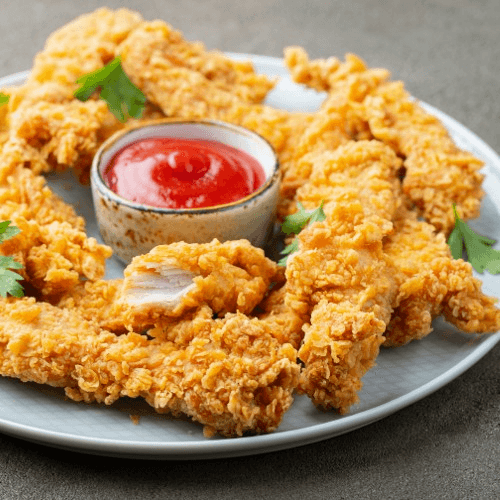 Boneless cubes of chicken marinated in corn flour batter, deep fried and tossed with chilly sauce and spices