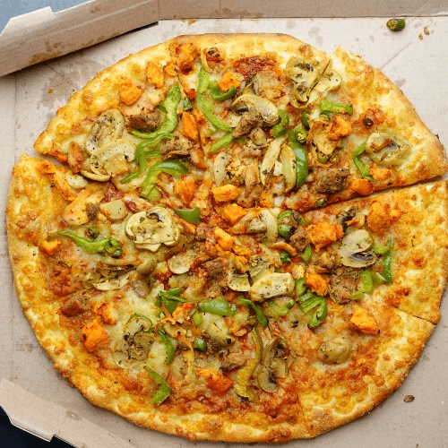 Marinated chicken/paneer/lamb, mushrooms, red onions, bell peppers, mozzarella cheese, Manchurian sauce topped with spring onion and ketchup.