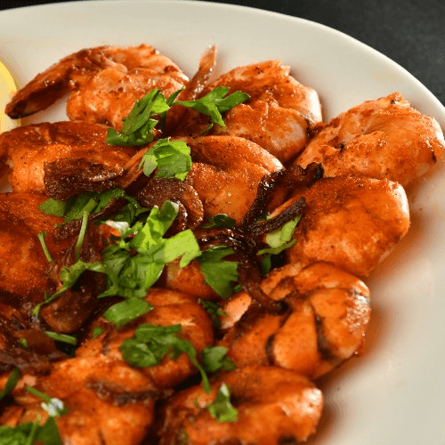 Shrimp roasted in a tandoor clay oven cooked with mildly spiced tomato gravy