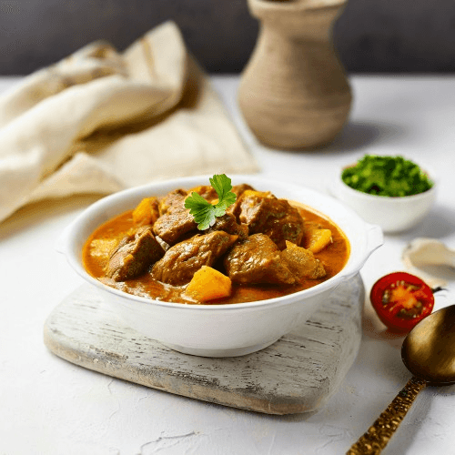 Tender pieces of seasoned boneless lamb simmered in a curry sauce with potatoes