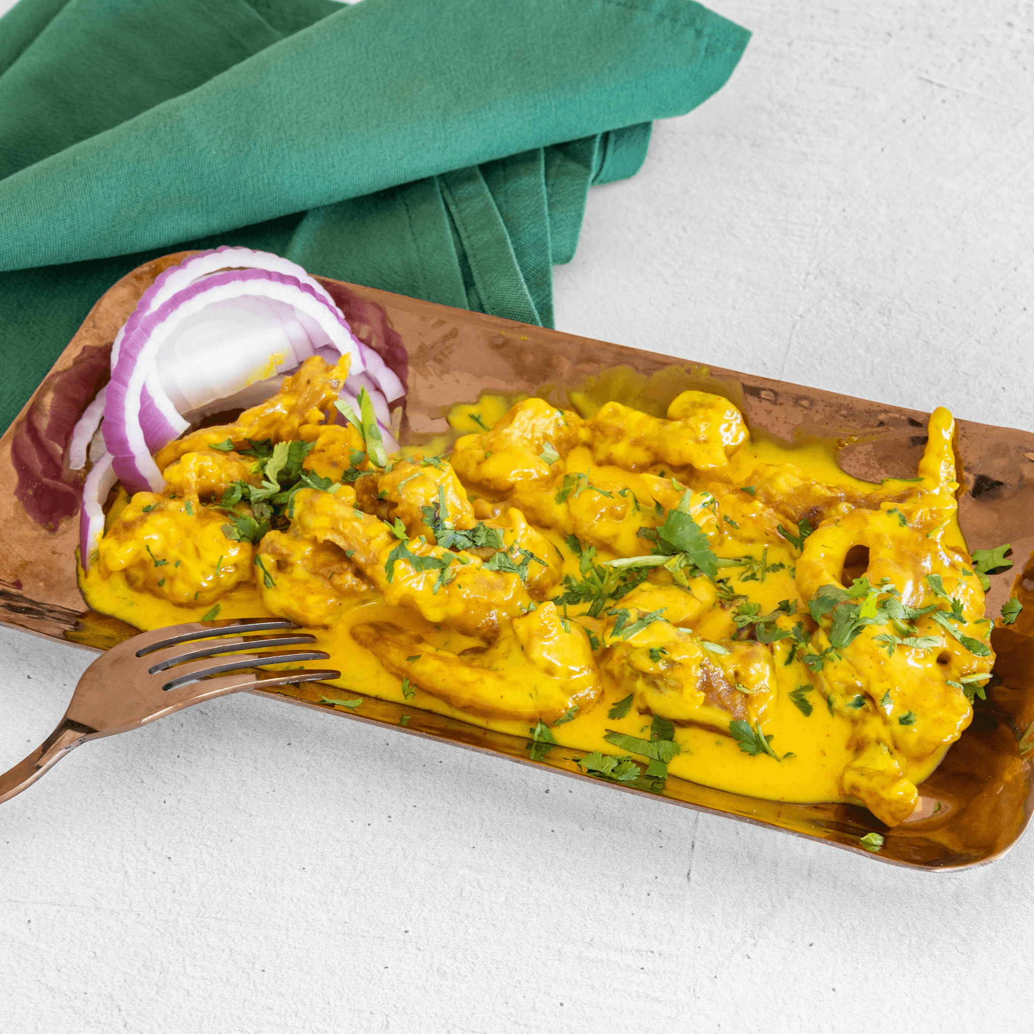 Boneless cubes of chicken marinated in corn flour batter with spices, deep fried and tossed with yogurt and spices