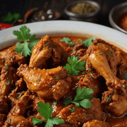 Tender chicken pieces cooked in rich coconut sauce and spices
