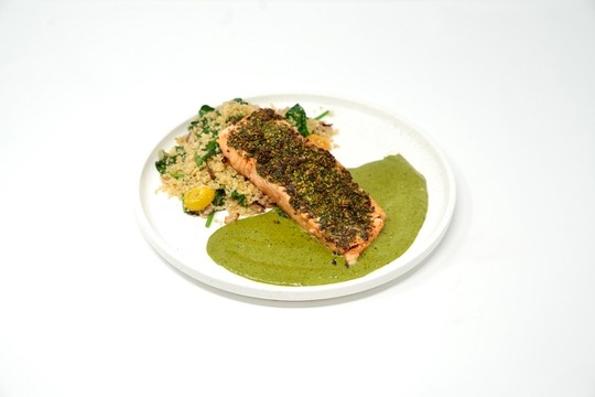Pistachio-crusted salmon, quinoa, grape tomatoes, wilted spinach, pesto sauce