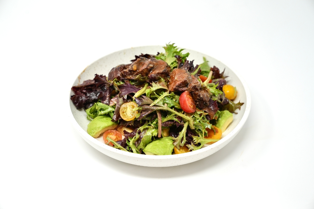 USDA prime hanger steak, mixed greens, cherry tomatoes, avocado, crispy French fries, Dijon vinaigrette, demi-glace
