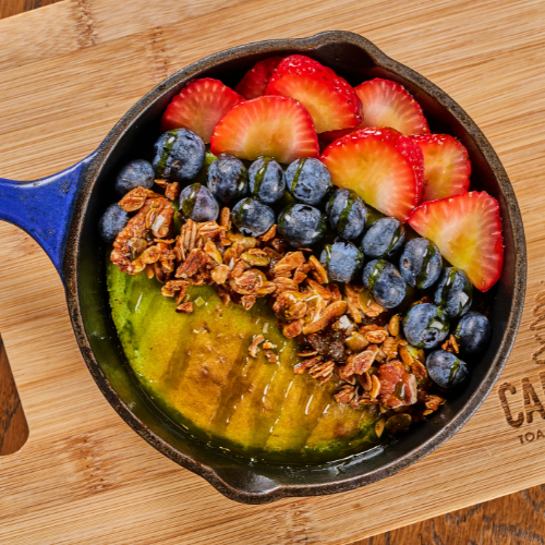 Carmela Matcha pancake base with strawberries, blueberries, granola, and pistachio syrup.