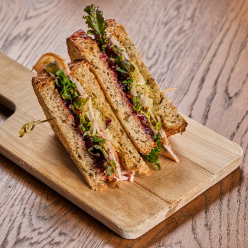 A handcrafted delight made with roasted turkey, creamy brie cheese, and our signature cranberry dressing, layered on multigrain bread with fresh mixed greens and a touch of basil sauce.
