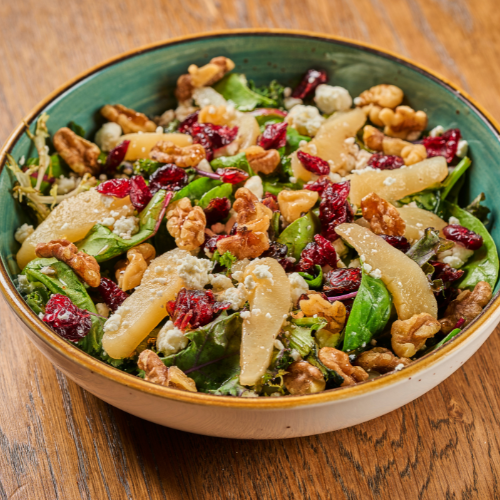 Fresh mixed greens topped with juicy pear slices, creamy goat cheese, crunchy walnuts, and sweet cranberries all brought together with our house-made red wine vinaigrette.