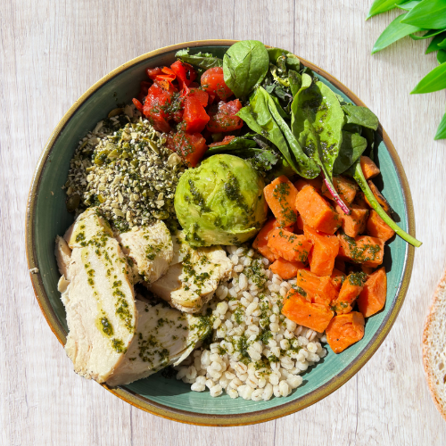 Chicken, Sweet potatoes, Mix Greens, Barley, Roasted tomatoes, Avocado, Mixed seeds
